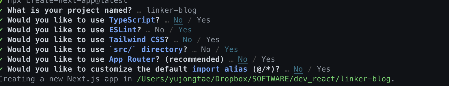 app router 를 사용하겠냐는 메세지가 나와서 사용하겠다고 했지만, 여러가지 문제가 있어서 아래와같이 사용하지 않게되었다.
