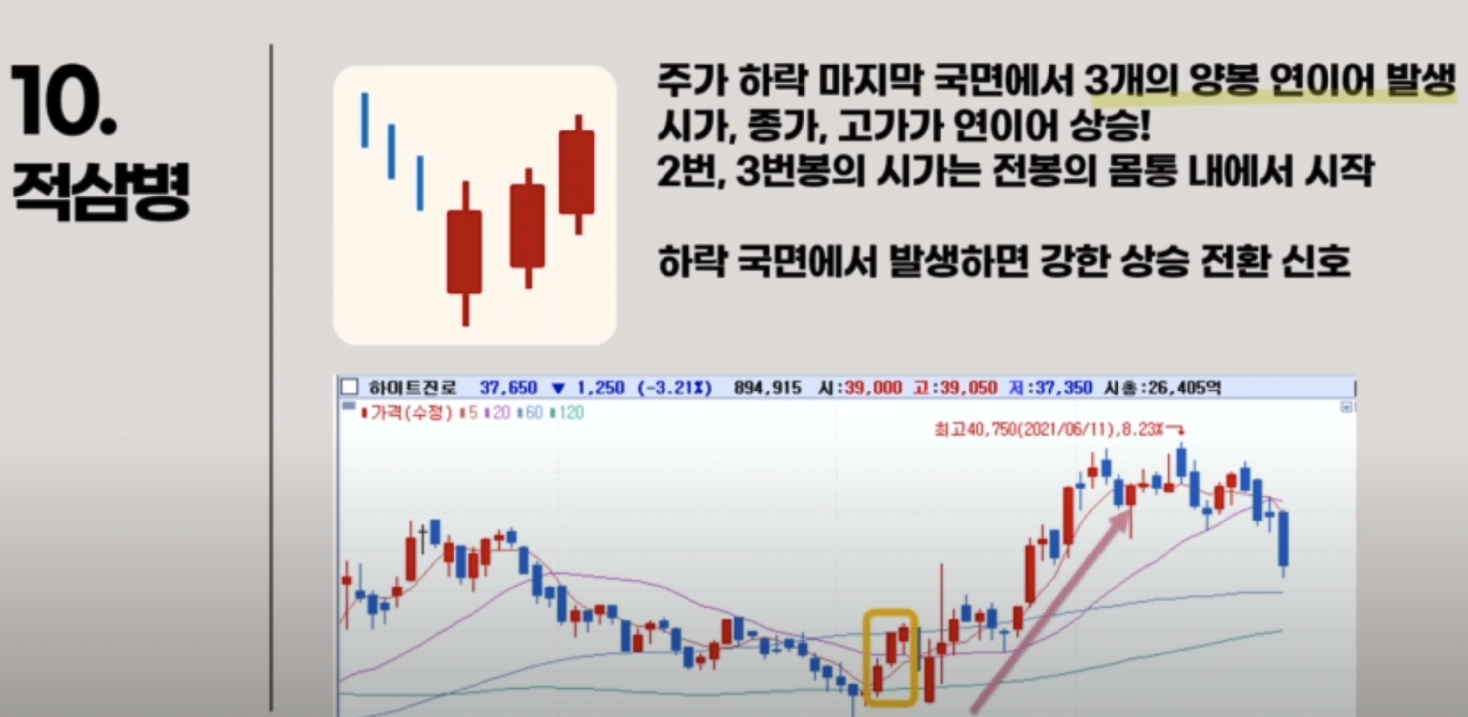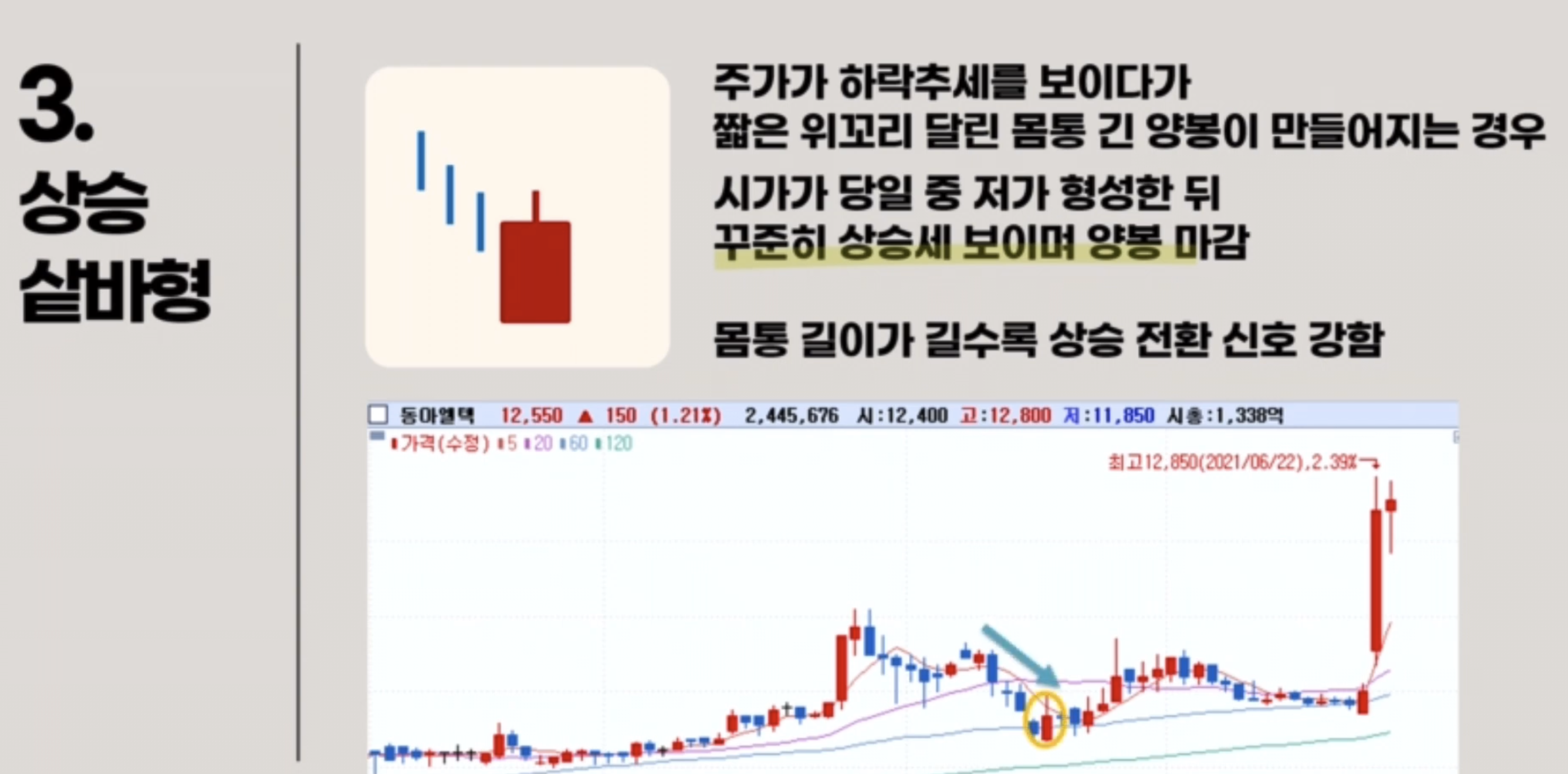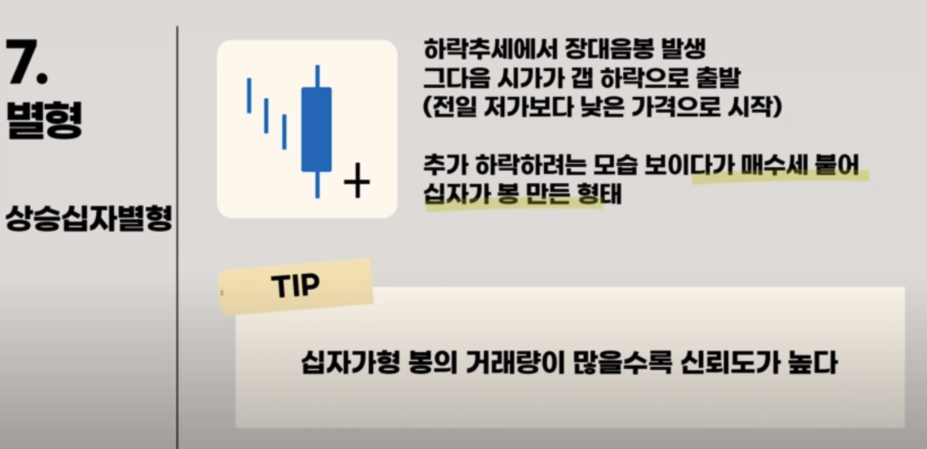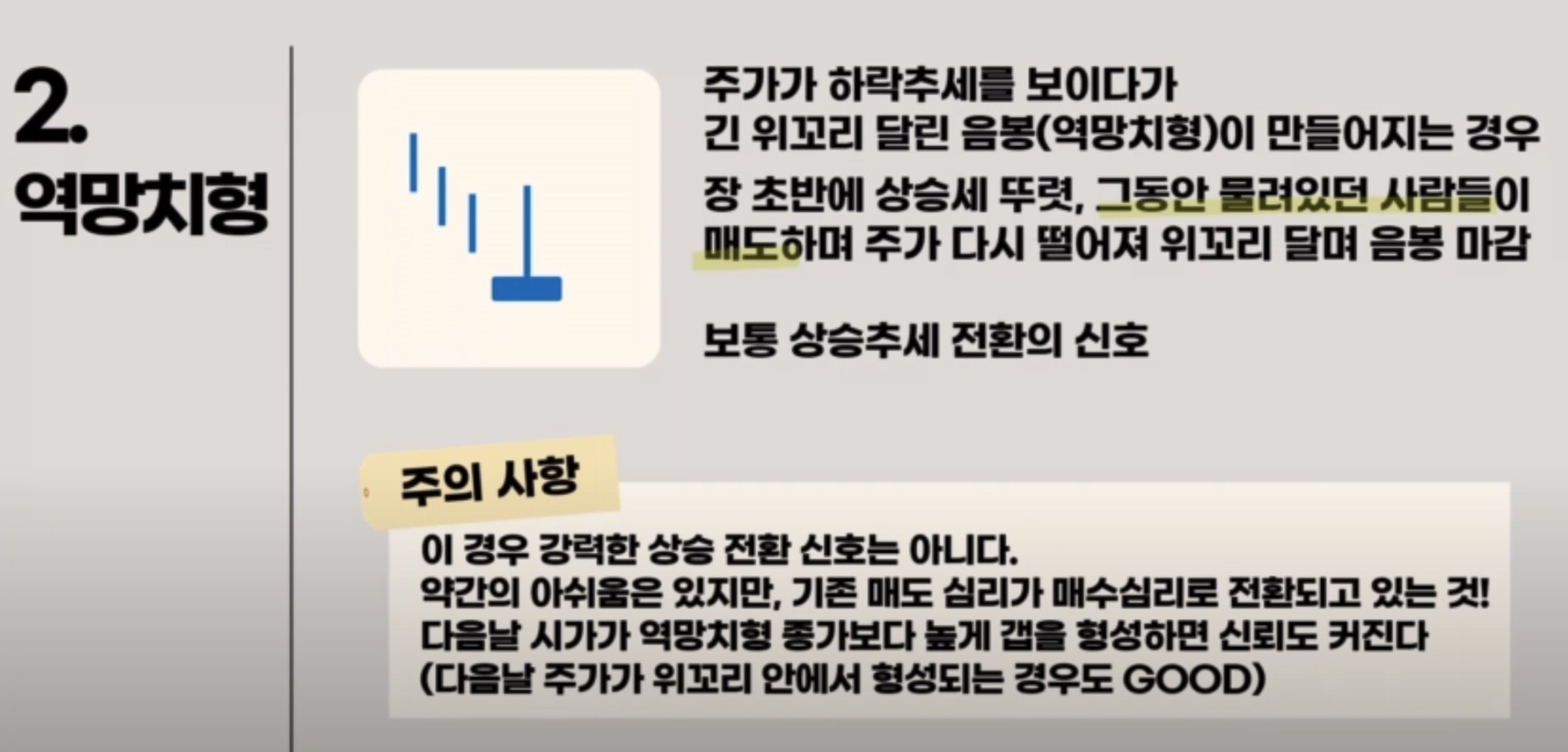 다만, 망치형의 경우 장중에 매수세가 유입되어 주가가 플러스로 마감했다는 뜻. 반등을 예상한 투자자가 많다. ( 점점 좋아질 때 )