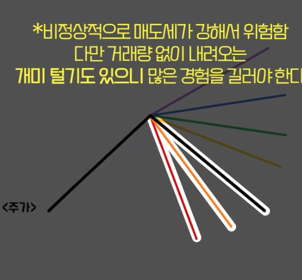 : 매집할때는 가격을 올리지 않으면서 매집한다. 그러다가 거래량이 돌면서 호재가 증가한다. 적정가치를 넘어서면 매도한다. 가격이 하락하면서 거래량이 증가한다. (진짜하락)