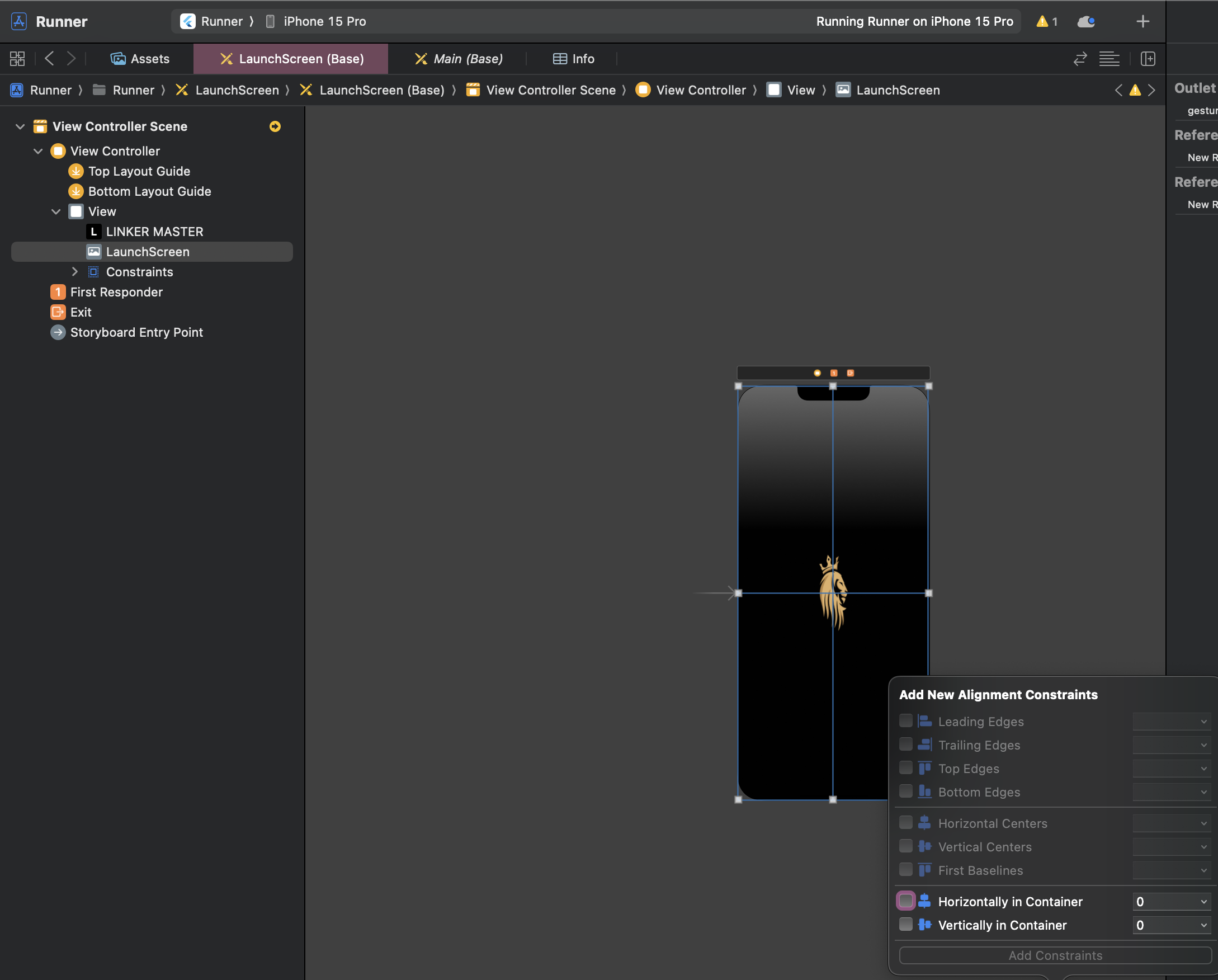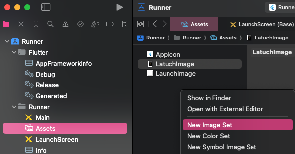 런치 스크린에 사용할 이미지를 준비합니다. 이미지 파일을 Runner/Assets.xcassets 폴더에 추가합니다.