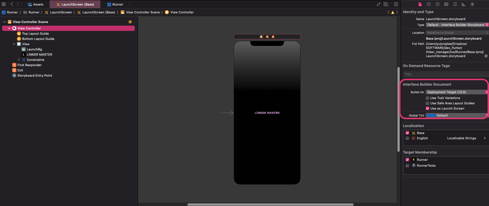 <string>LaunchScreen</string>**혹은 Info > Lauch screen interface file base name 값을 LaunchScreen.storyboard