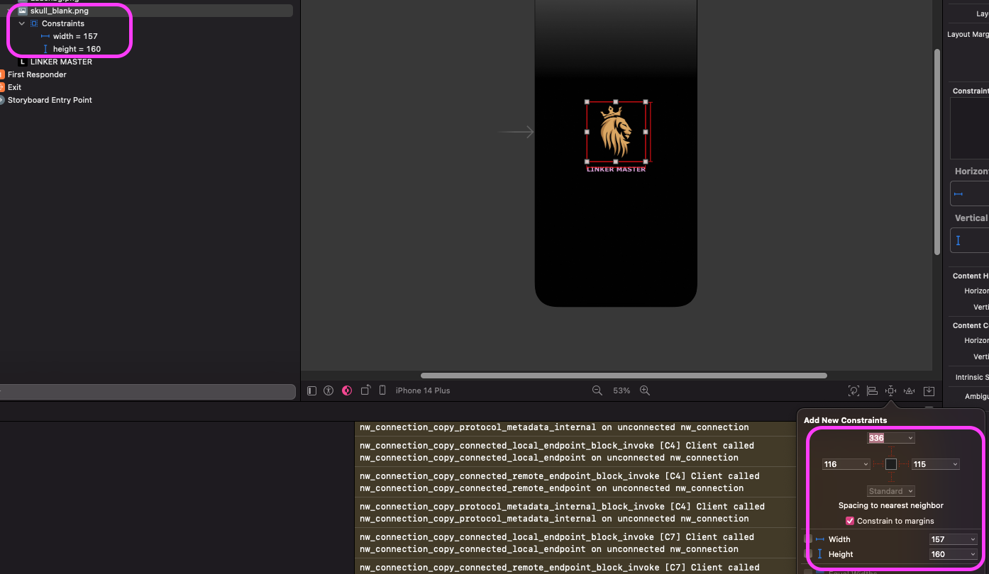 Constraints : centerX,Y vertical, horizontal. 중앙에 위치하도록하여 화면 정중앙에 위치시킴