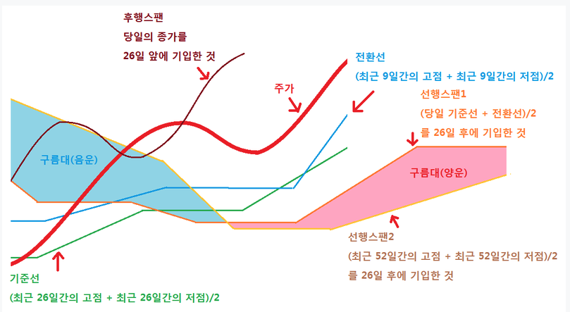 지표 설명 : 오늘의 봉차트는 일목균형표는 25일전에 형성된 거래이다. ( 오늘 캔들이 26일 앞에 구름대를 생성한다. ).