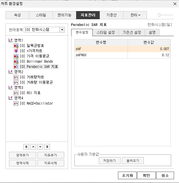 • 초기 값 (pAf): Parabolic SAR 계산에서 가속 계수의 시작 값을 설정합니다.