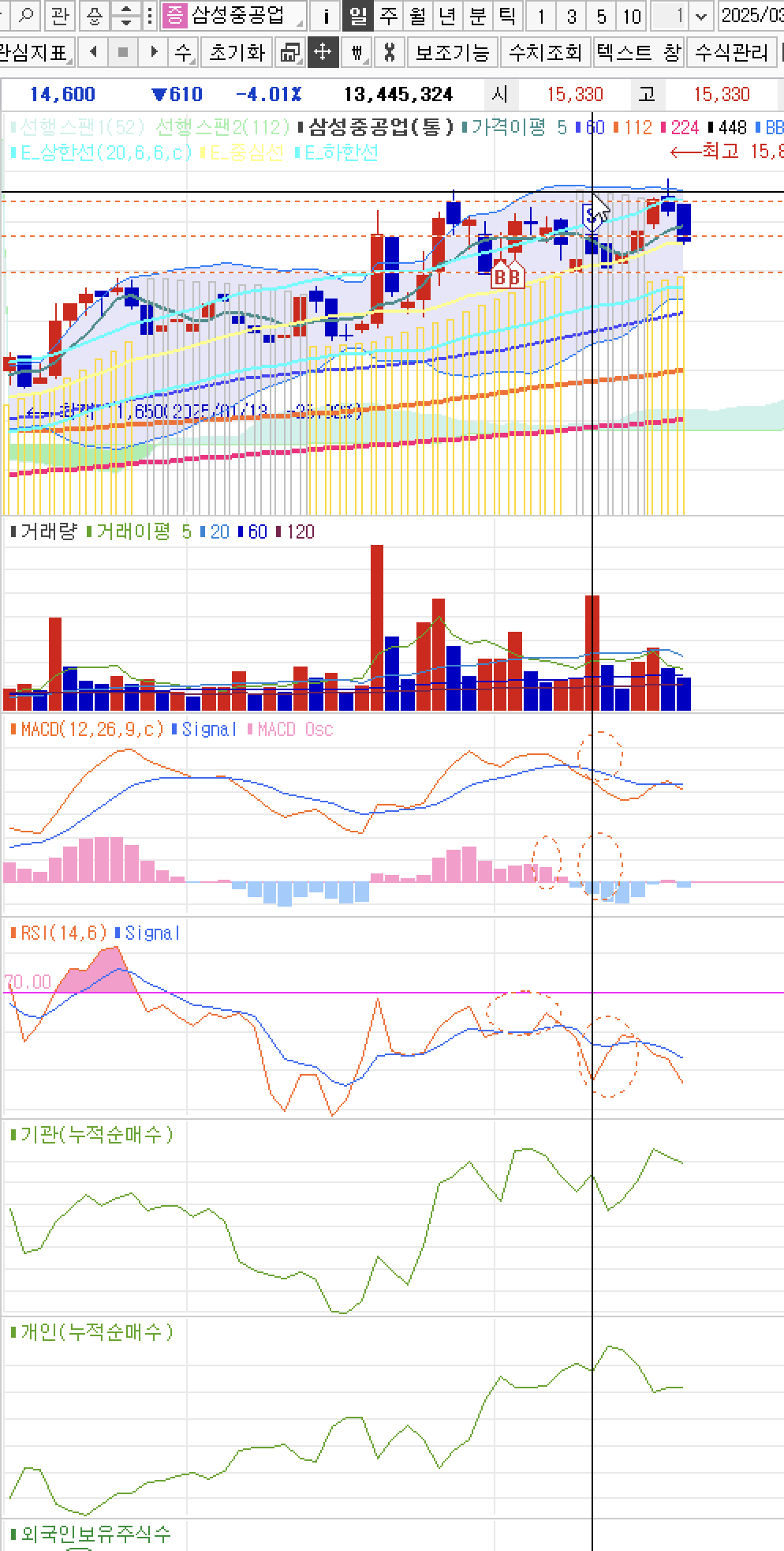 - 볼린저밴드 상단과 많이 멀어짐