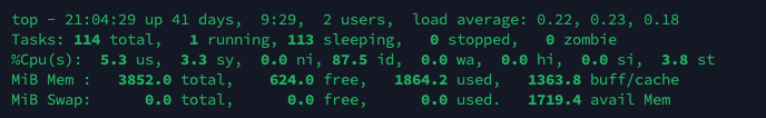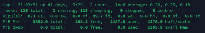 top - 17:27:25 up 41 days, 5:52, 2 users, load average: 0.10, 0.17, 0.18 Tasks: 114 total, 1 running, 113 sleeping, 0 stopped, 0 zombie %Cpu(s): 0.2 us, 0.3 sy, 0.0 ni, 99.3 id, 0.0 wa, 0.0 hi, 0.0 si, 0.2 st MiB Mem : 3852.0 total, 99.3 free, 2399.6 used, 1353.1 buff/cache MiB Swap: 0.0 total, 0.0 free, 0.0 used. 1184.1 avail Mem