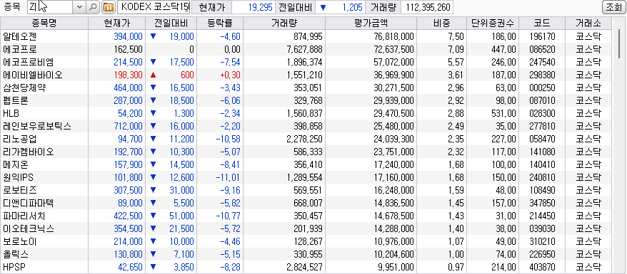 예를들면 알테오젠, 에코프로, 에코프로비엠, HLB, 레인보우로보틱스, 리가켐바이오 등 ETF 상위종목들이 1월 22일 기점으로 모두 가파른 상승을 보였다.